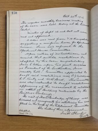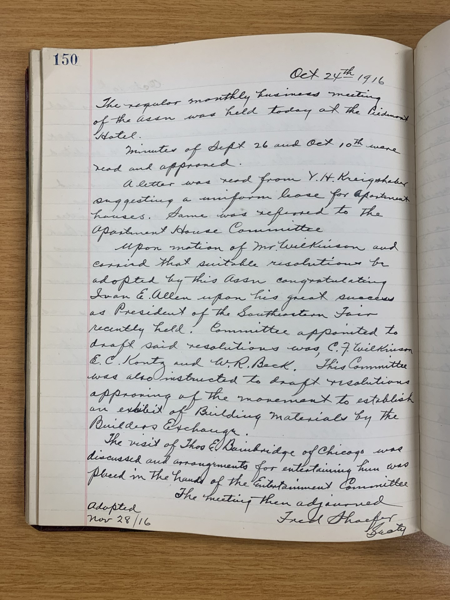 1916 | ResolutionAccording to the minutes of the October 24, 1916, regular monthly business meeting, BOMA Atlanta passed a resolution congratulating Ivan E. Allen for success service as President of the Southeastern Fair.